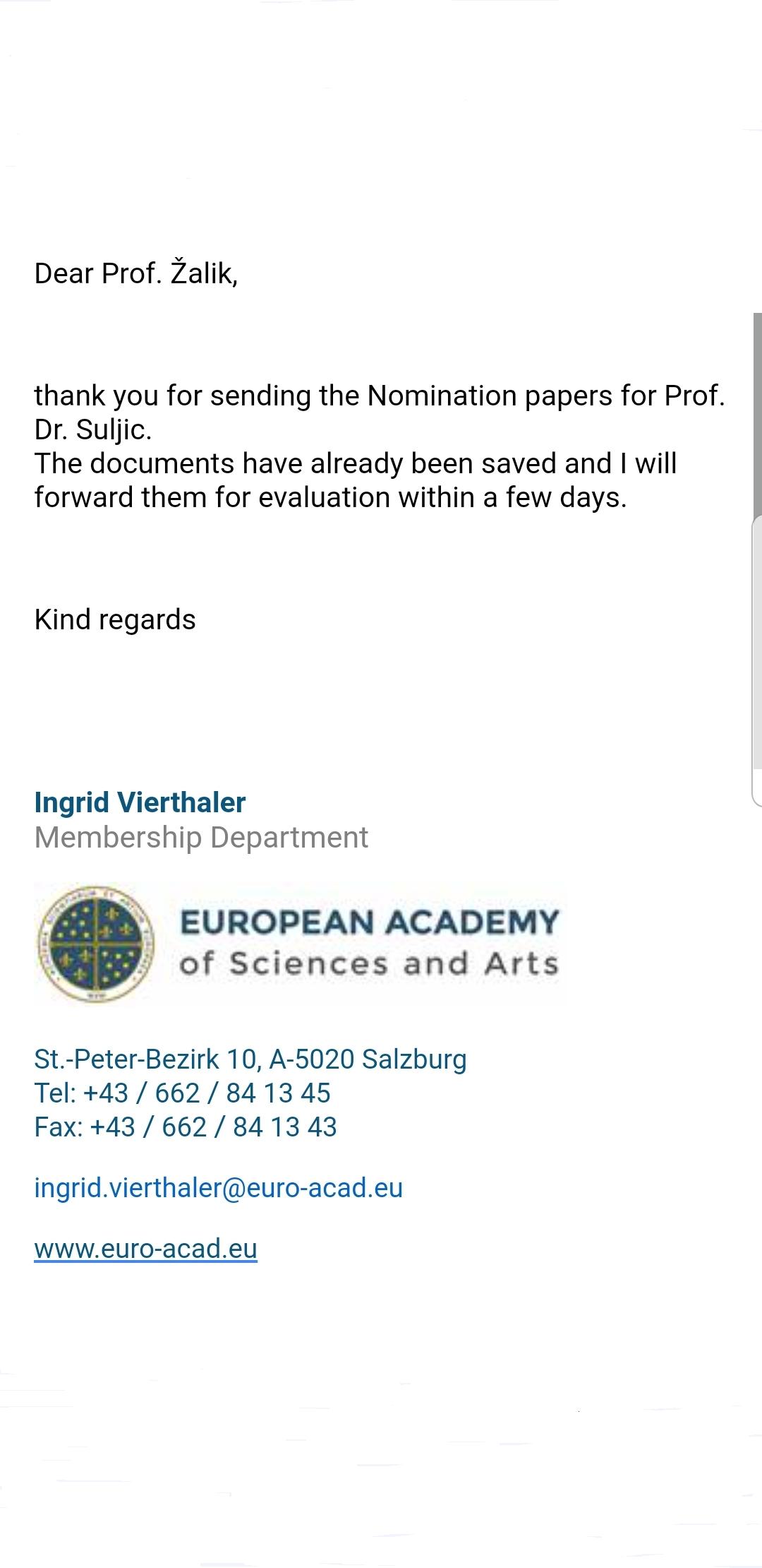 NOMINACIJA ZA ČLANA EVROPSKE AKADEMIJE NAUKA I UMJETNOSTI: